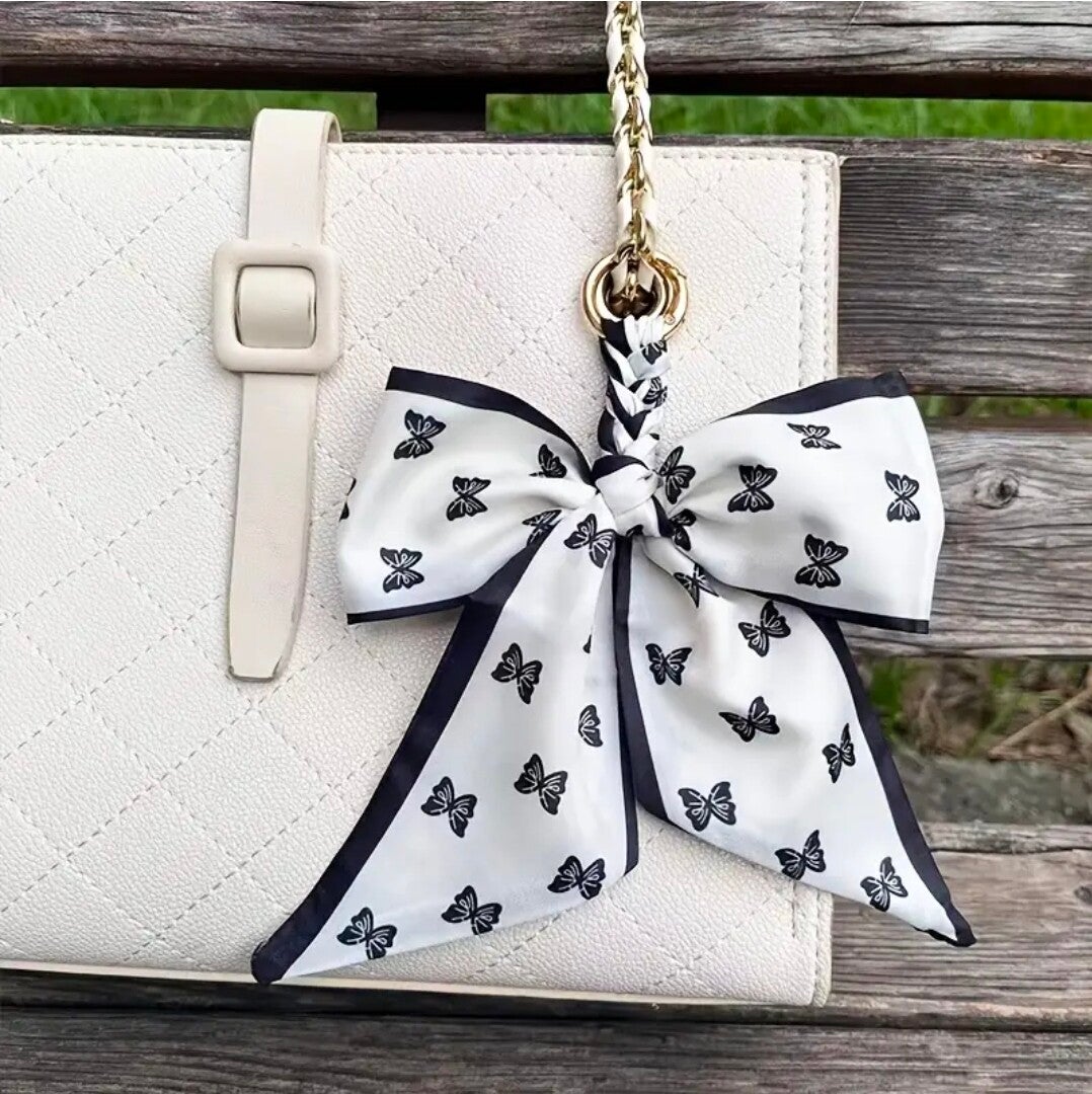 Dekorativ stoffsløyfe som gir vesken et feminint og stilfullt uttrykk. En enkel måte å tilføre personlighet og et mykere preg på både håndvesker, sekker og nøkkelknipper.