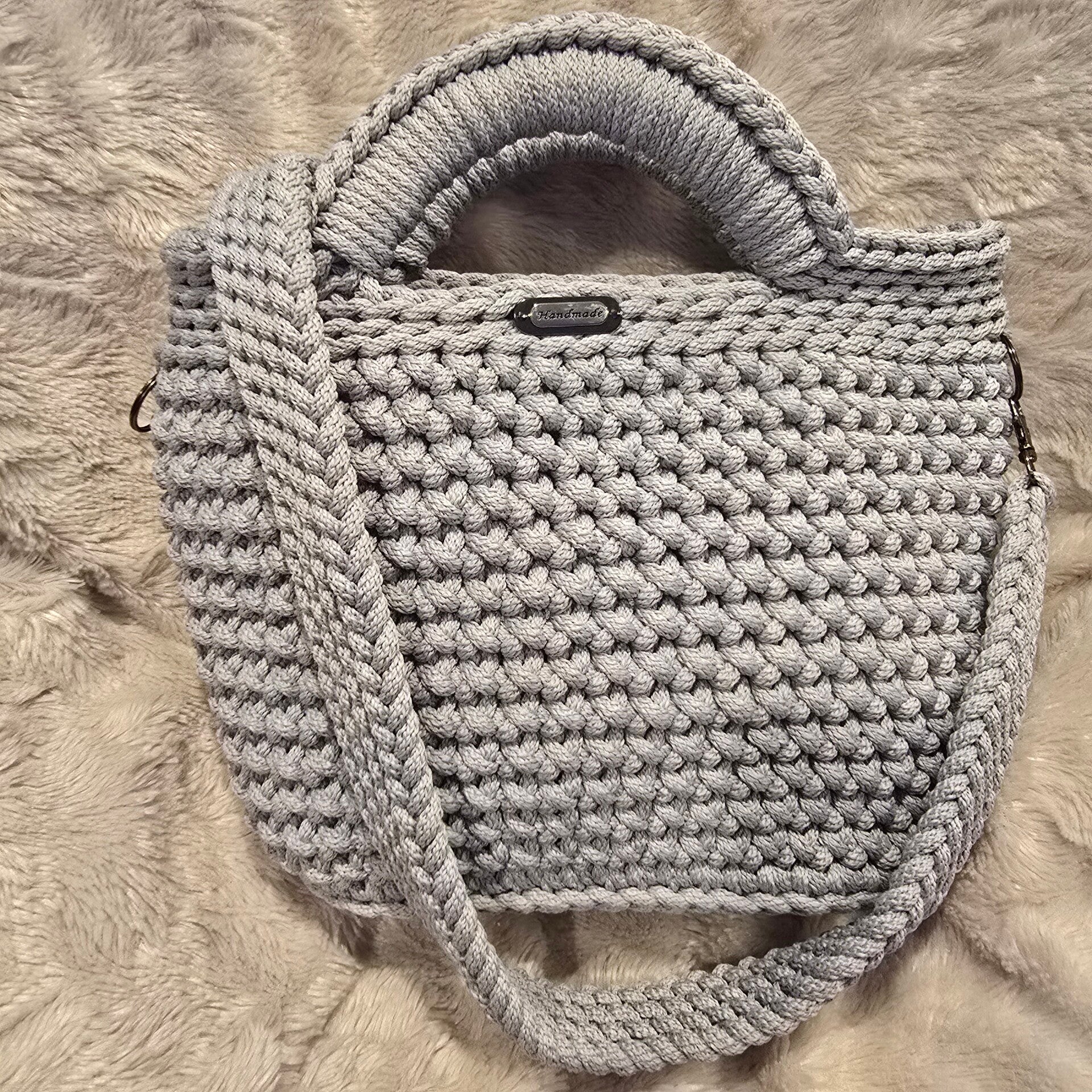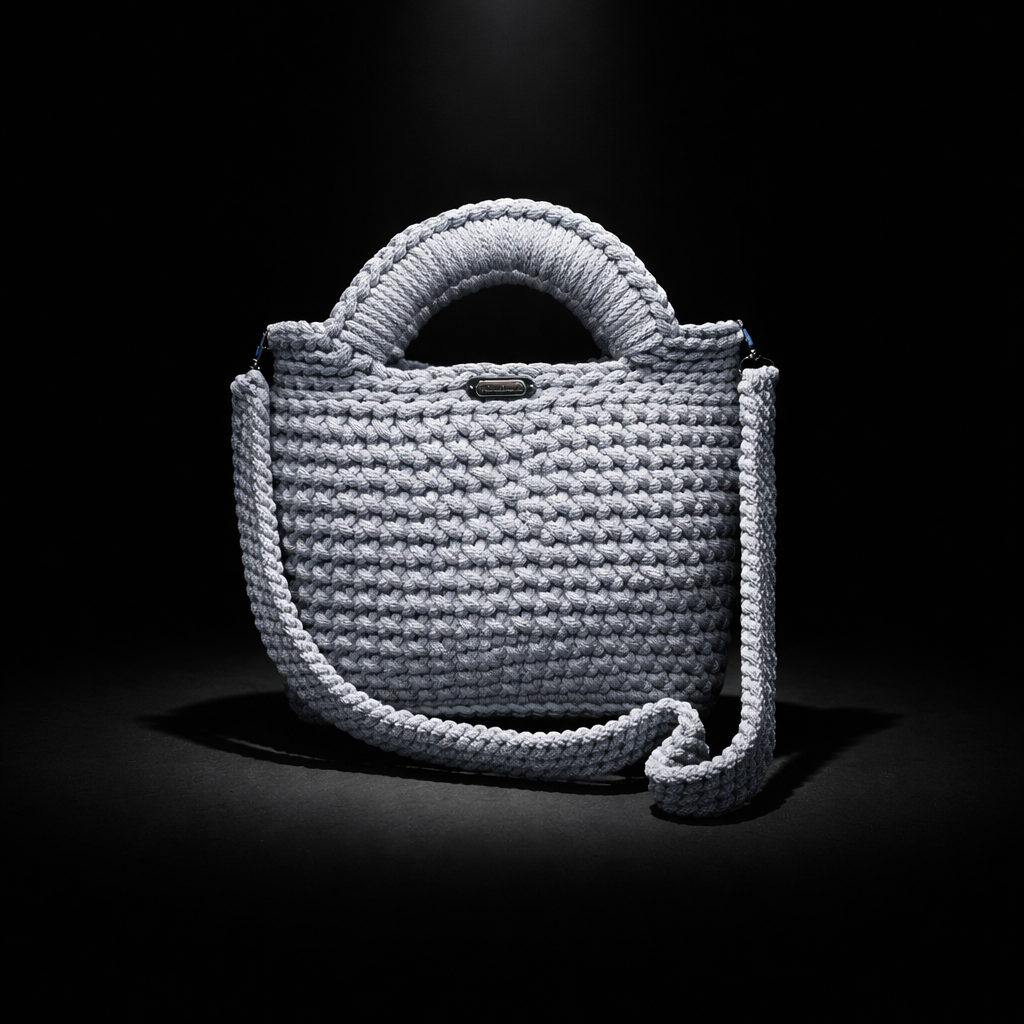 Vesken er heklet med 6 mm polyestertråd, noe som gir en tydelig struktur og god holdbarhet. Den faste bunnen i lys grå imitert skinn sørger for stabilitet og gjør at vesken holder formen godt. Sorte og sølvfargede detaljer tilfører en elegant kontrast og et gjennomført uttrykk.