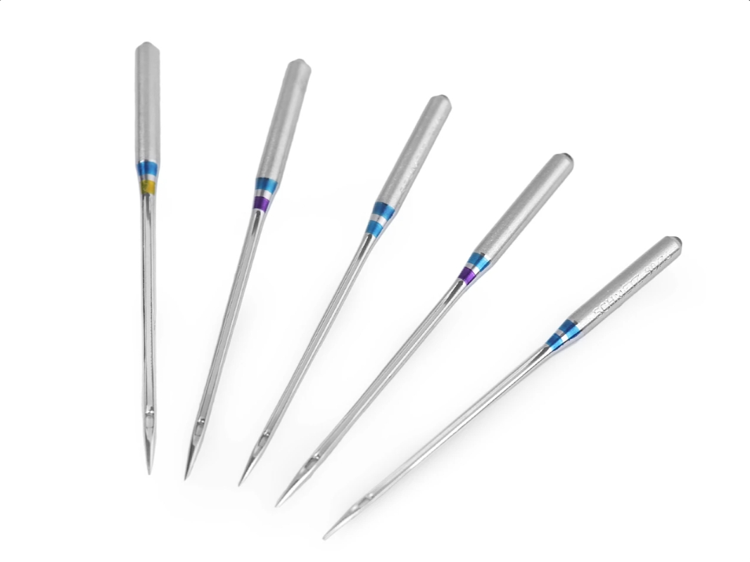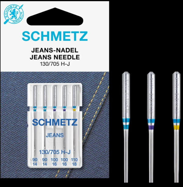 Symaskinnåler i system 130/705H-J, spesielt utviklet for tykke og sterke materialer som denim og sytau. Nålene har en middels kuleformet spiss som skyver stofftrådene til side i stedet for å skade materialet. Dette gir jevne, sterke sømmer og reduserer risikoen for nålbrudd og hoppesting.