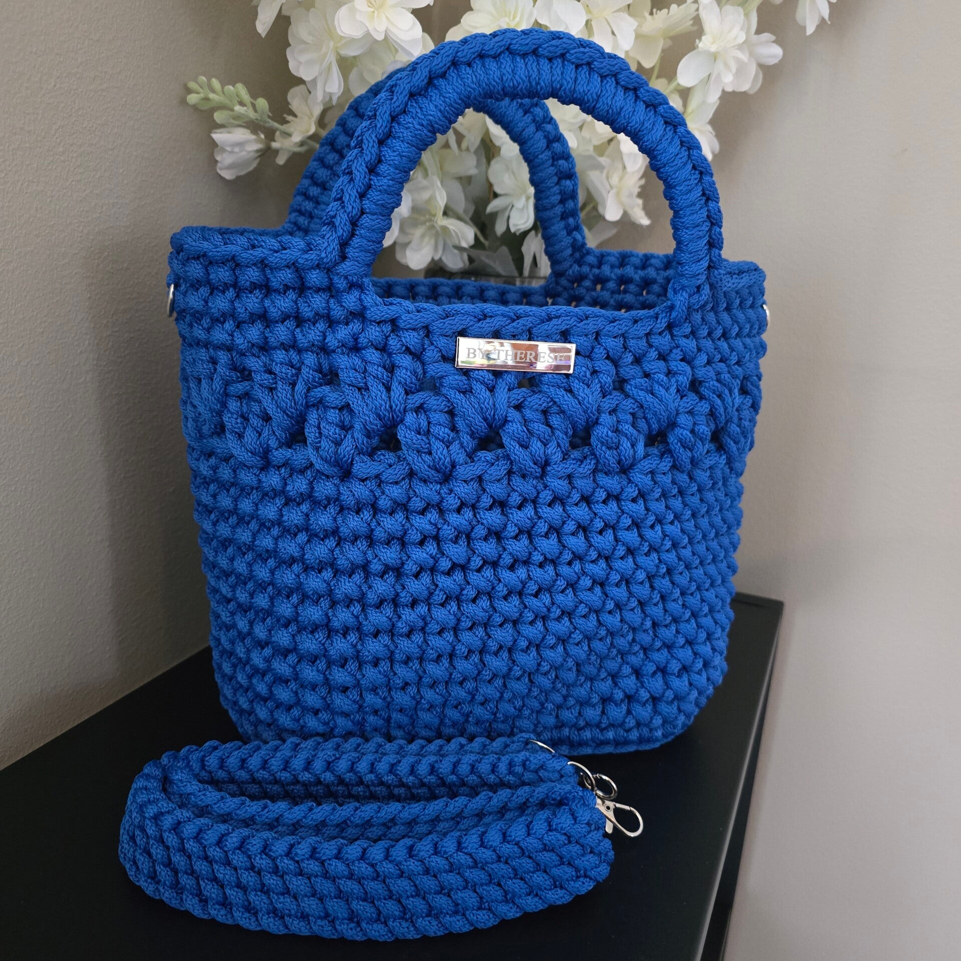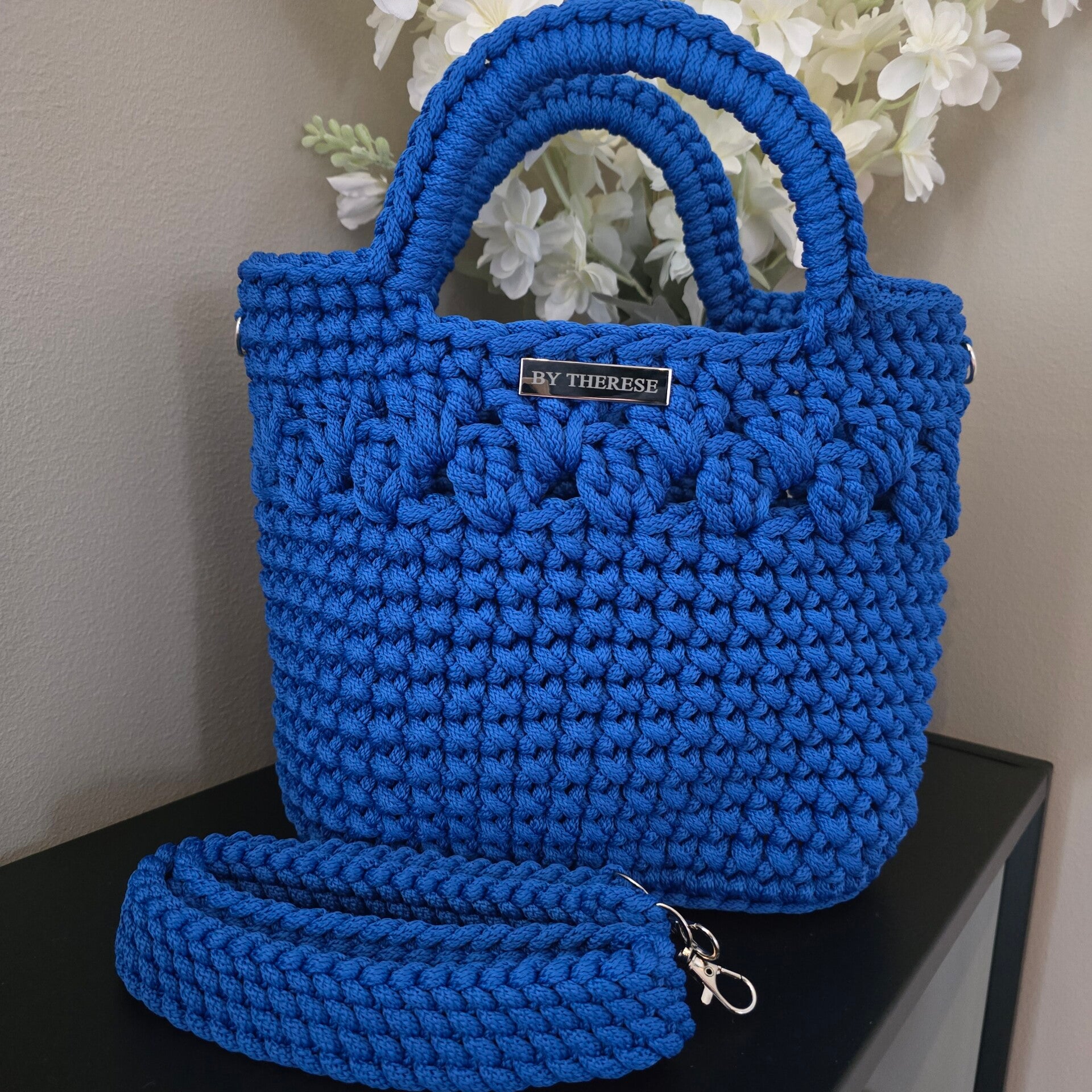 Håndheklet veske i en klar og elegant blåfarge som gir et friskt og sommerlig uttrykk. Vesken er laget i slitesterk polyestertråd og har et strukturert heklemønster som gir både stabilitet og et eksklusivt preg.