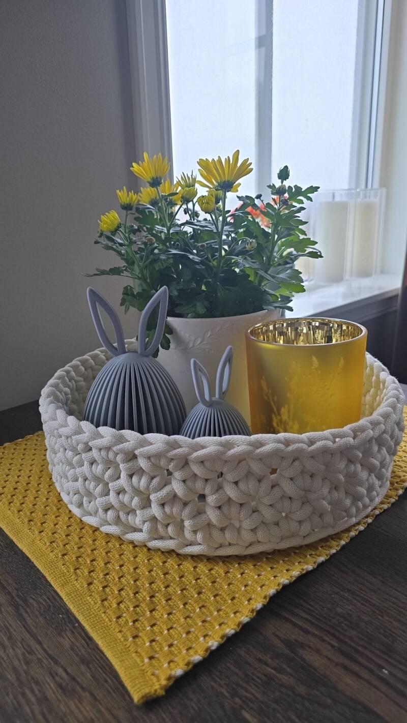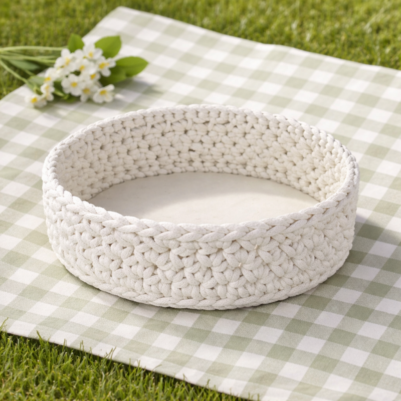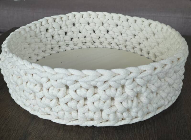 Fatet har en diameter på 30 cm og en høyde på 8 cm. Bunnen er i kryssfiner, noe som gir god stabilitet og sørger for at det holder fasongen. Det er håndheklet i 8 mm soft bomullssnor fra Bobbiny. Fargen på bildet er offwhite.
